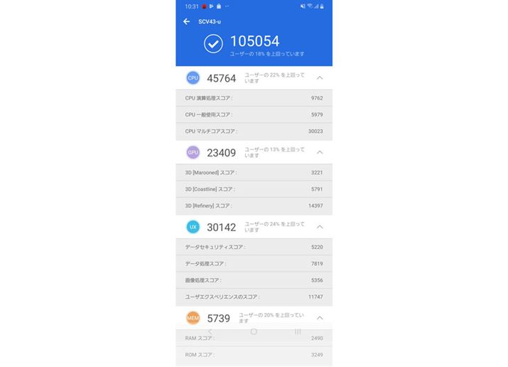 実際の処理性能をベンチマークテストアプリ「AnTuTuベンチマーク」を使って計測したところ、総合スコアは105,054(内訳、CPU:45,764、GPU:23,409、UX:30,142、MEM:5,739)となった。このスコアは、このクラスでは競合となるファーウェイの「nova lite 3」や「P30 lite」の総合スコア13万点前後と、シャープ「AQUOS sense2」の7万点代前半の大体中間で、4年前に登場したハイエンド機並みのレベルだ。
