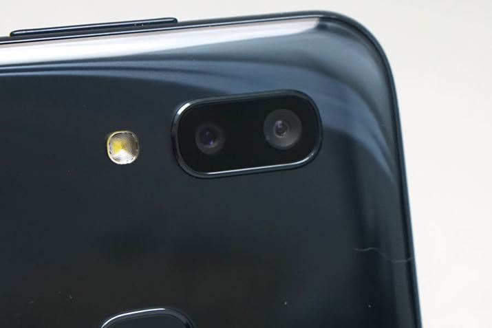 本機のメインカメラは、約1,300万画素の標準カメラと、約500万画素の広角カメラを組み合わせたデュアルカメラで、光学2倍のズームが行える。フロントカメラは約800万画素だ。上位モデルの「Galaxy S10」シリーズ同様にAIを使ったシーン認識機能を備えているが、認識できるシーンの種類が19種類(「Galaxy S10」は約30種類)と少ない。また、メインカメラとフロントカメラのいずれも、光学式および電子式手ぶれ補正機構が搭載されていない。