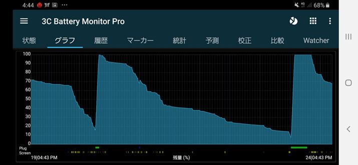 検証を行った5日間のバッテリー消費のペースを示したグラフ。2回の充電だけで済んでおり、バッテリーはかなり持続する