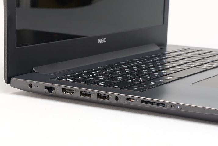 外部インターフェイスは左側面にまとめられています。USB 3.0 Type-C、USB 3.0×2、HDMI出力、ギビガビットLAN、SDメモリーカードスロット、ヘッドホン/マイク端子などメインマシンにふさわしい充実装備です。