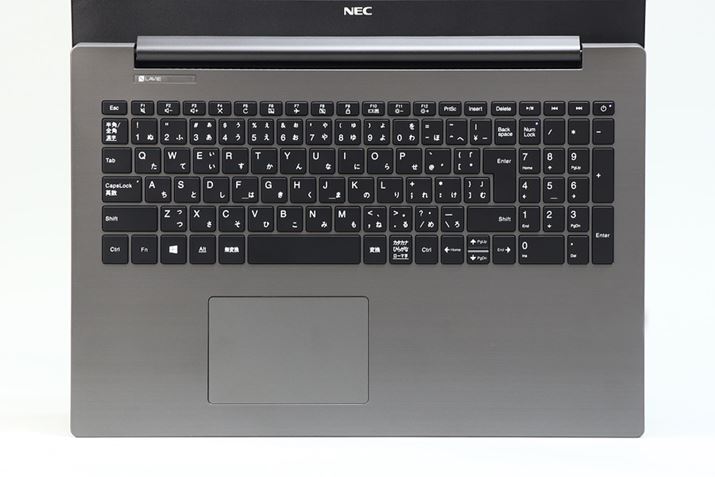 キーボードは数字の入力に便利なテンキー付き。キーピッチはいわゆる「フルサイズ」と言われる約19mmで、デスクトップPC用のキーボードと変わらないピッチとなっています