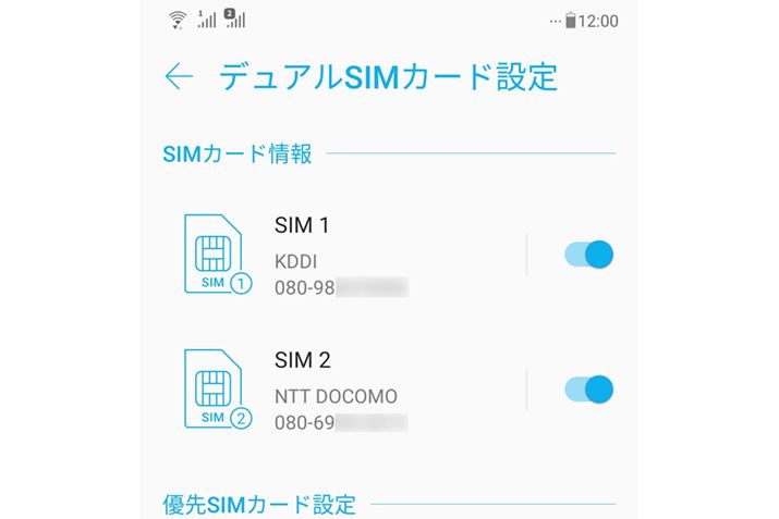 DSDS機能に対応するスマホでは、2枚のSIMカードで同時に電話の着信を待ち受けることができます(画像はASUS JAPAN「ZenFone 5」のデュアルSIMカード設定画面)
