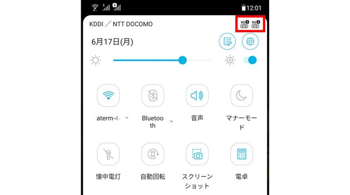 DSDVにも対応するZenFone 5の場合、通知パネルにVoLTEが有効であることを示すピクトアイコンが2つ表示されます(右上の赤枠内)