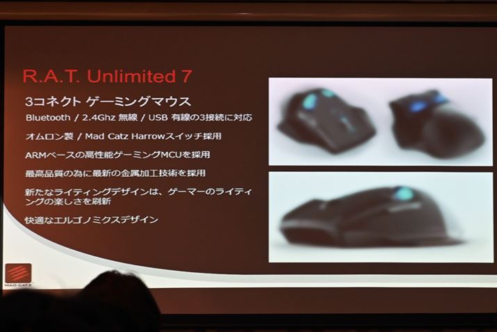 開発中のハイエンドゲーミングマウス「R.A.T. Unlimited 7」。USB/Bluetooth/無線の3つの接続方式に対応とのこと。パームレストには金属パーツが採用されるそうだ