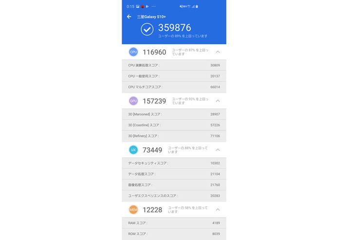 AnTuTuベンチマークの総合スコアは359,876。Androidスマホの中ではソニー「Xperia 1」やシャープ「AQUOS R3」とともに最速グループに属する