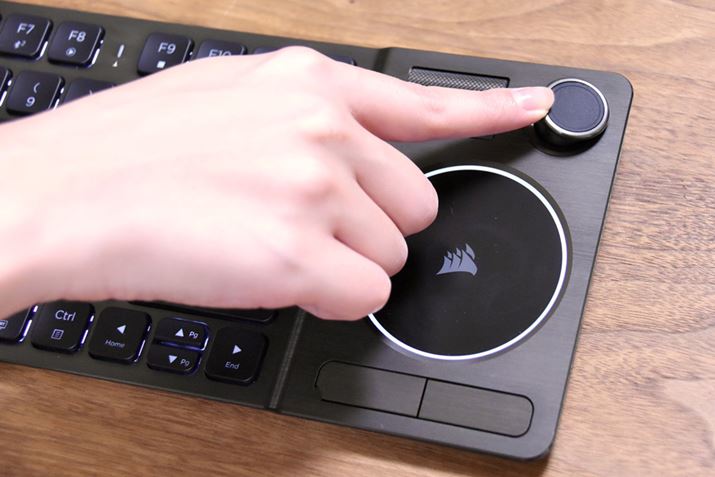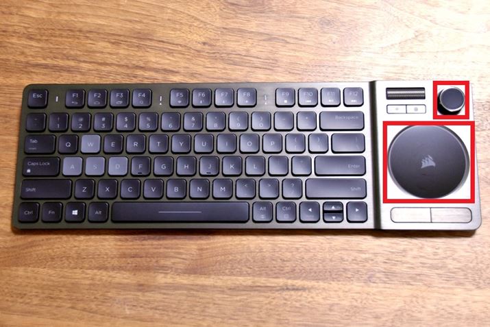 CORSAIRのワイヤレスゲーミングキーボード「K83 Wireless」。キーは、77キー英語配列。キーボードの右上にジョイスティック、その下に円形のタッチパッドを備えています
