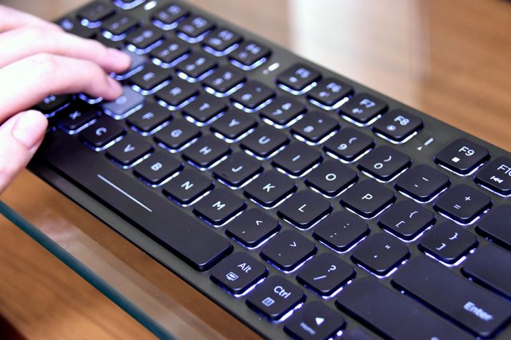 キータッチが軽く、ノートPCのような感覚で、あまり力を入れずに入力できます。また、WASDキーは、ほかのキーと区別できるように色分けされています。画像はバックライト点灯時ですが、消灯時でも、色の違うWASDキーが見やすいです