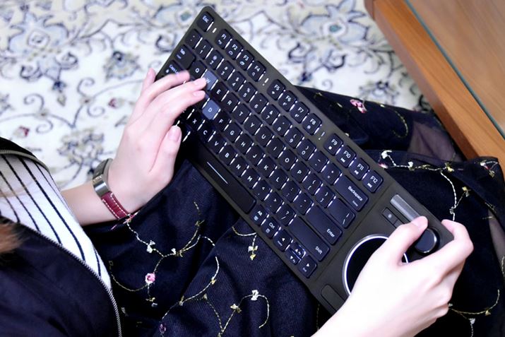 製品が届いて梱包から出してみると、思っていたより、ずっとおしゃれなルックスのキーボードが出てきました。素材は、つや消しアルミニウムを使用して、とてもスタイリッシュ。落ち着いたデザインなので、これなら、リビングに置いても違和感がなさそうです。また、キーボード右側に、ジョイスティックやタッチパッドが集約されており、使い勝手もよさそうです。