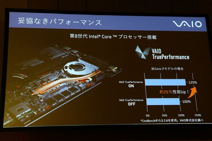 VAIO TruePerformanceのオン・オフの比較。Core i7モデルの場合は、オンにすると性能が約25%アップするという