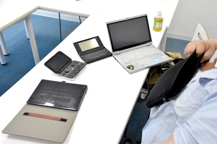 取材当日、大嶋氏が持ってきた愛機たち。左から「iPad Pro」(アップル)、「GPD WIN」(GPD)、「MC-CS12」(NEC)、「CF-AX3」(パナソニック)