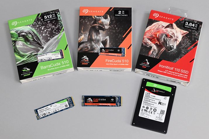 左から、スタンダードNVMe SSD「BarraCuda 510」、ゲーミング向けハイエンドNVMe SSD「FireCuda 510」、NAS向けSATA SSD「IronWolf 110」