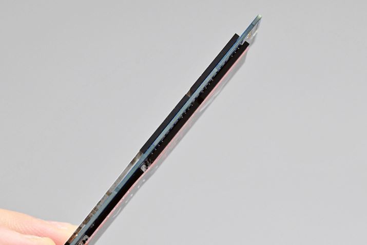 真横から見ると表裏両方にNANDフラッシュが実装されていることがわかる。ちなみに、コントローラーICは表側に配置されている