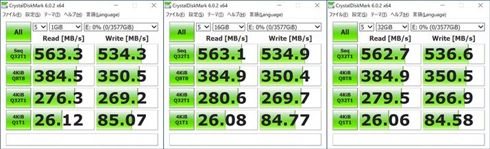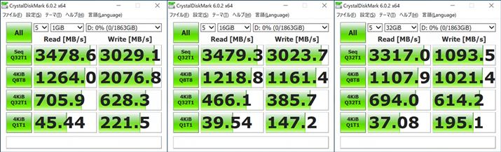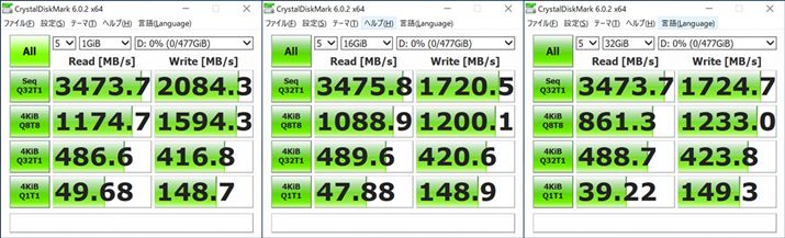 まずは「CrystalDiskMark 6.0.2」から見ていこう。テストサイズ1GiBの結果を見ると、シーケンシャル性能はおおむね公称スペック通りの速度が出ており、NVMe接続のBarraCuda 510とFireCuda 510のシーケンシャルリードは、最大32Gbps(4000MB/s)のNVMe接続の限界に迫る数値だ。