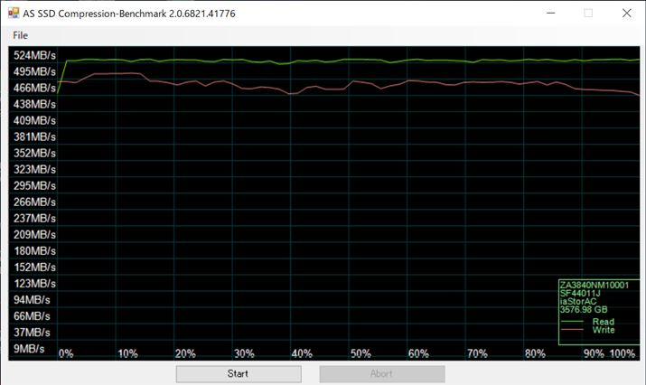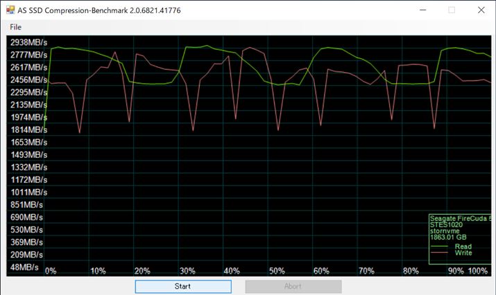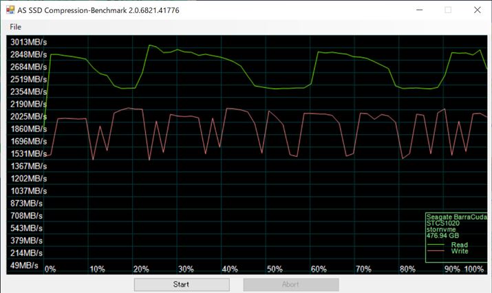 データ圧縮の変化によるパフォーマンスを計測するコンプレッションベンチマークは、NVMe接続タイプの2製品がリード/ライトともにやや波が激しい。ただ、全体的には公称値の7〜8割くらいのパフォーマンスは出ているので、問題はないだろう。IronWolf 110については、独自のデータ圧縮技術「DuraWrite」がしっかりと効果を発揮しているようで、圧縮率に関わらず、ほぼ一定のパフォーマンスが出ていた。