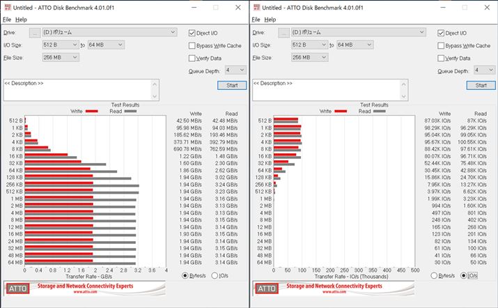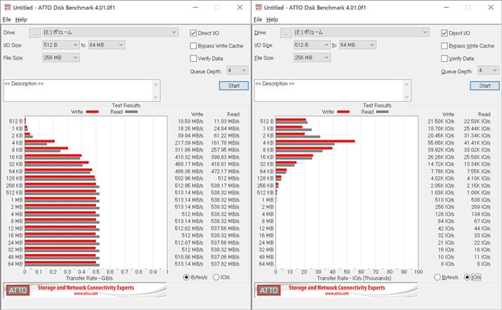 続いて、「ATTO Disk Benchmark 4.01.0f1」の結果だ。こちらも、先に紹介した2つのベンチマーク結果と傾向は同じ。NVMe接続タイプはピーク性能がやや届いていないものの、64KB以降は公称スペックにかなり近いパフォーマンスが得られていることが確認できる。IronWolf 110もSATA 6Gb/sの限界に近い値で、なかなかのパフォーマンスといえる。