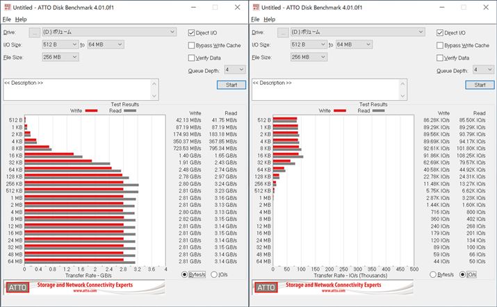 シーケンシャルライトについては、28GBのSLCキャッシュを備えたFireCuda 510のほうがやはり一枚上手で、3,000MB/s超という値をたたき出している。ただ、テストサイズ32GiBの結果を見てもらうとわかるが、SLCキャッシュ容量の28GBを超過すると、パフォーマンスがガクっと下がっているのがわかる。この辺りは、SLCキャッシュを備えた一般的なSSDと同様の傾向だ。