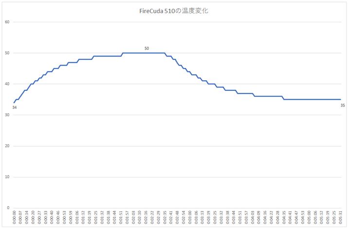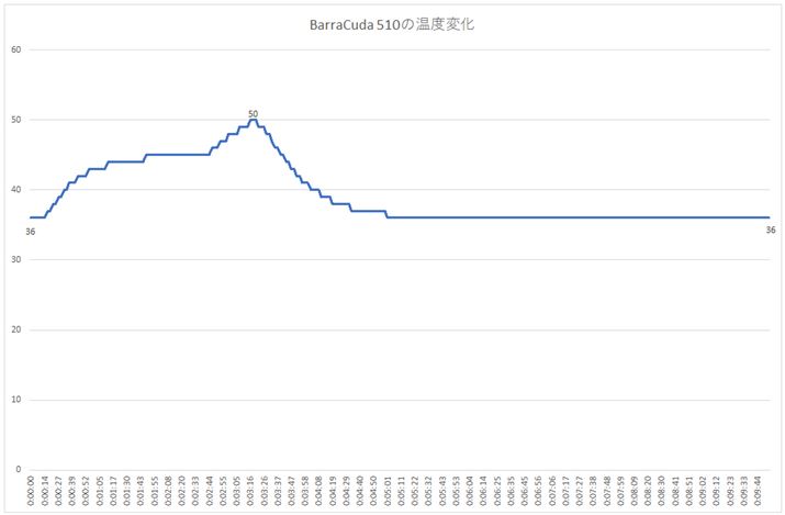 BarraCuda 510とFireCuda 510ともに、温度がピークに達したのはベンチマーク終盤で、ピーク温度は50℃を記録した。ただ、グラフを見てもらうとわかるが、ピーク温度が同じ50℃でも、BarraCuda 510が瞬間的に50℃を記録したのに対し、FireCuda 510はピーク時の温度がやや長めに続いている。ベンチマーク終了後も、BarraCuda 510がすぐに温度が下がり始めているのに、FireCuda 510はやや緩やかな温度変化だ。