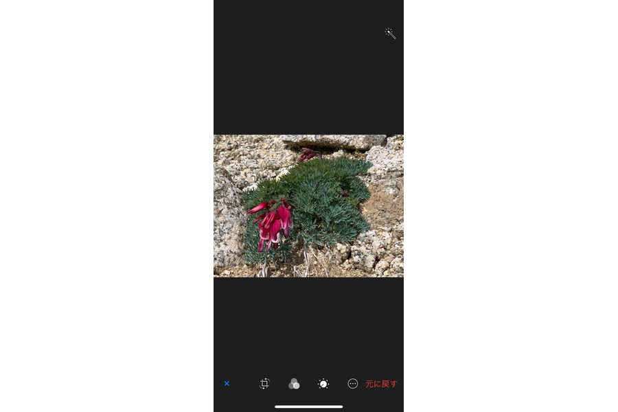 iPhoneの「写真」アプリの編集画面。画面右上と下部に並ぶ編集ツールを使って写真を修整する