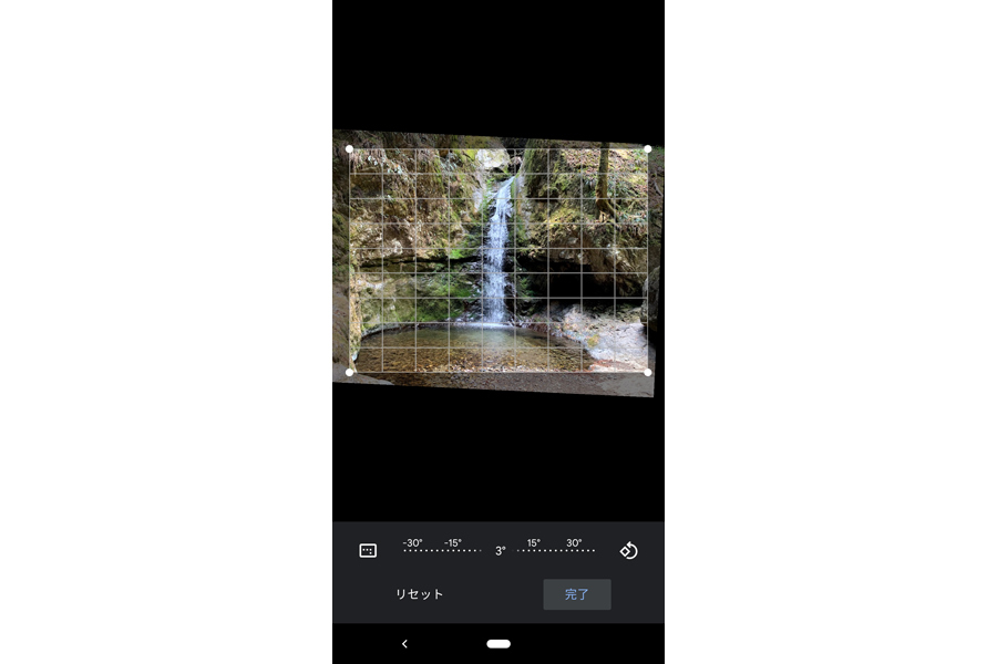 Android(「Google フォト」)でトリミングや傾きの修整を行うには、「Google フォト」を起動して修整したい写真をタップして開き、画面下部左から2番目のボタンをタップ。編集画面になるので、画面下部左から3番目のボタンをタップする。