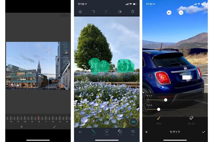 スマホに標準で搭載されている編集機能でできないことは、写真編集アプリを活用しよう。歪みの修整やオブジェクトの除去、モザイク入れなどが手軽にできる