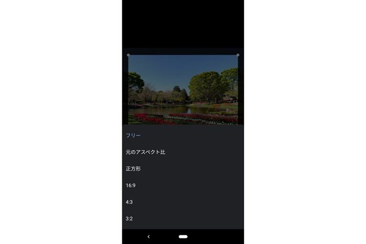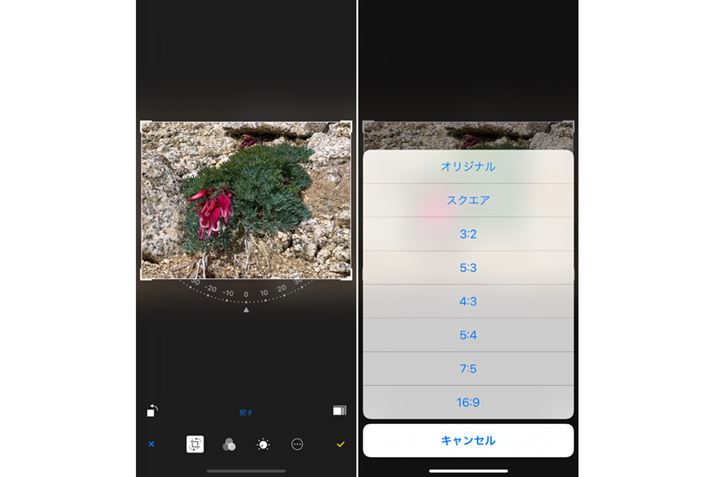 角度調整のスライダー左にあるボタンをタップすると、写真の縦横比が選べる。スライダーの右にあるボタンは、タップするごとに90°ずつ、反時計回りに回転する