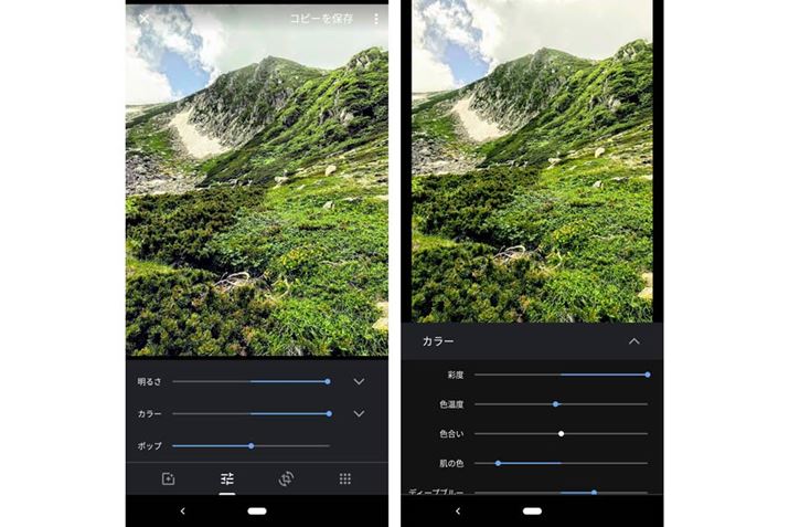 色の修整は「カラー」をタップ。スライダーが表示されるので、左右にドラッグして修整する。また「ライト」と同様に、より詳細な修整もできる。
