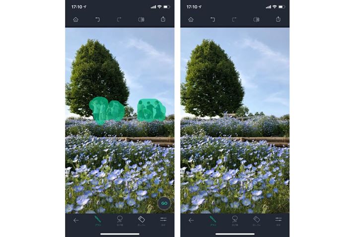 「オブジェクト除去」の「ブラシ」を使い、取り除きたいオブジェクトをドラッグして指定する。「GO」ボタンをタップすれば、違和感なく不要物を取り除くことができる(画面は「iPhone XS」の使用例、Androidも操作は共通だ)