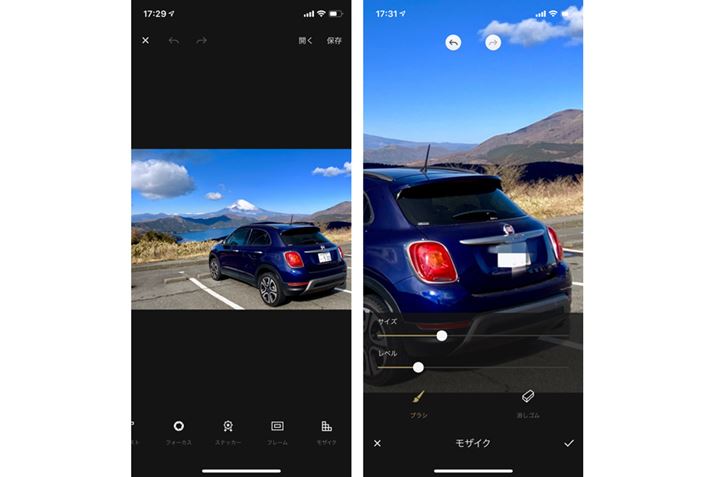 「モザイク」ツールを選んだら、「ブラシ」でモザイクをかけたい部分をドラッグする(画面は「iPhone XS」の使用例、Androidも操作は共通だ)