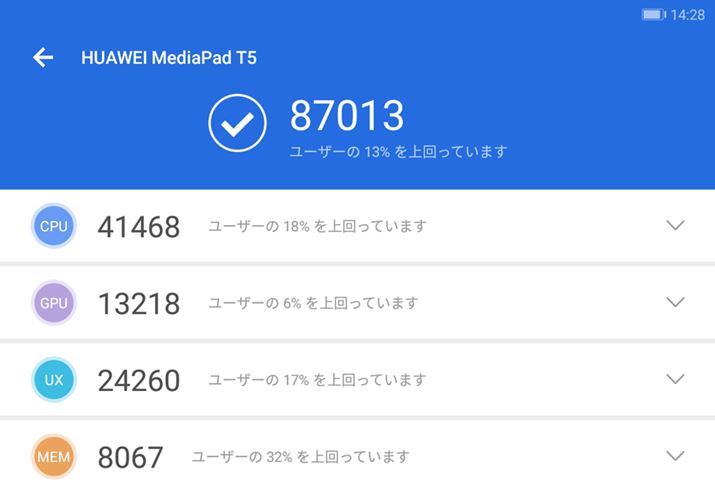 「Antutu Benchmark v7.2.3」では、「ユーザーの○%を上回っています」という具合に、自分のタブレットやスマートフォンがどれだけの性能なのかがわかる。項目別に見ると、「MEM」が「ユーザーの32%を上回っています」となっており、ほかの項目よりも高かった