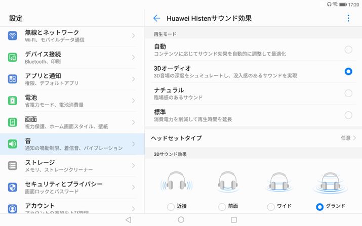 ファーウェイ独自のサラウンド技術「Histen」の設定画面。ヘッドホンやイヤホンを使って、臨場感のあるサウンドを堪能できる