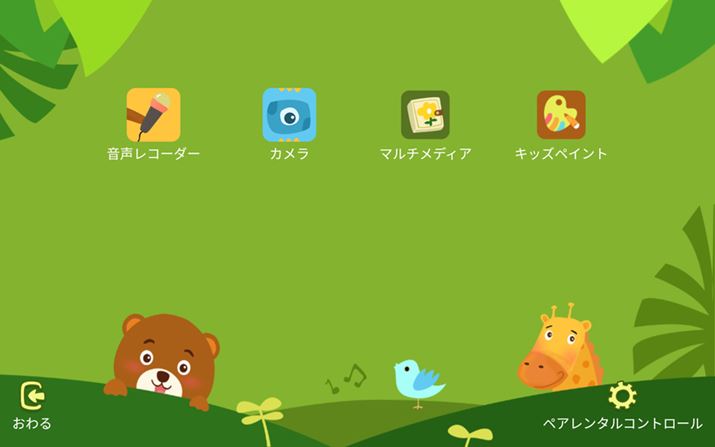 かわいらしいイラストが描かれた「キッズモード」の画面。ペアレンタルコントロールだけでなく、カメラで遊んだり、キッズペイントでお絵描きをしたりできる