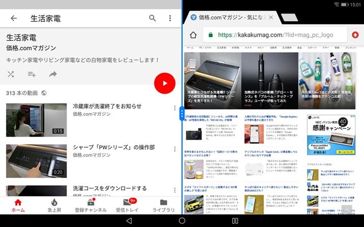 2つのアプリを同時に表示できる「画面分割機能」。「MediaPad T5」は画面サイズが10.1型と大きいので、2つのアプリを開いても窮屈な表示にならないのがポイント