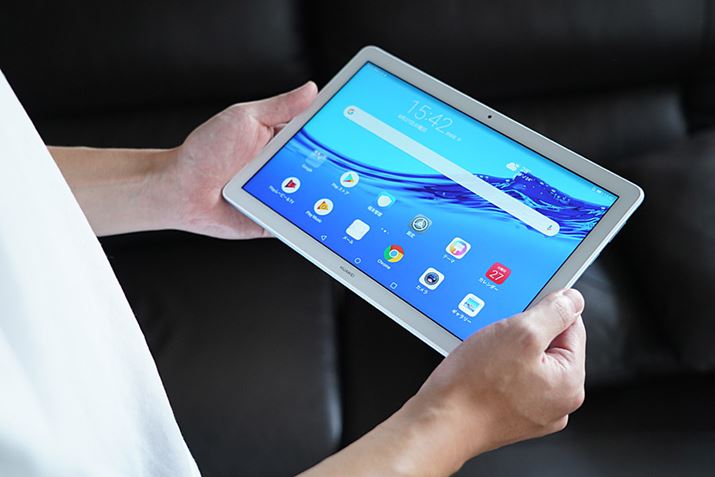 10.1型のタブレットとしてはスリムで軽量な「MediaPad T5」。小さすぎず、大きすぎず“ちょうどいい”サイズ感で、家でくつろぎながら使ってもよし、外出先に持っていってもよしの万能タブレットだ
