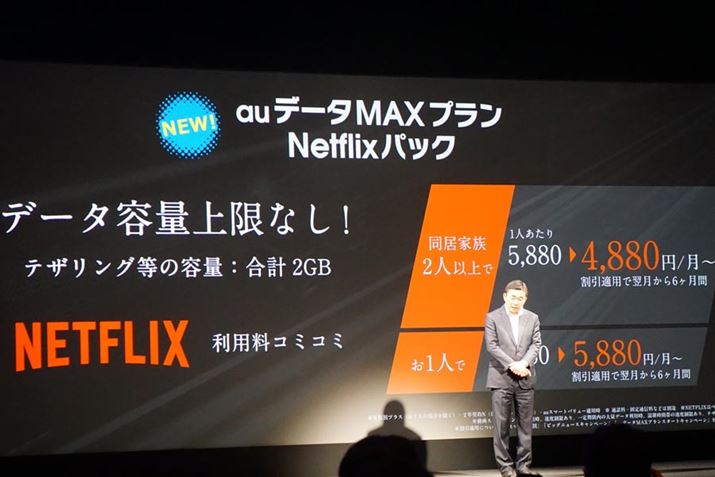 auの新料金プラン「au データMAXプラン Netflixパック」は、データ通信容量が無制限で(テザリング、データシェア、世界データ定額については月間2GBの制限あり)、「Netflix」のベーシックプラン(月額800円)をセットにしたもの。月額料金は7,880円(「2年契約N」適用時。詳細は後述)。auでは、従来プランと比較して、実質的に最大で2,400円相当の値下げになるとしている。