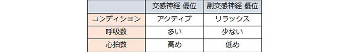 自律神経の状態についてご存知の方も多いと思うが、交感神経、副交感神経と呼吸や心拍の関係性は以下のようになっている。