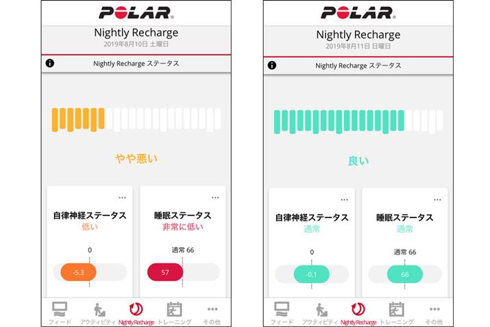 「Ignite」を2週間ほど使用してみたところ、「Nightly Recharge」が自分のコンディションを知るうえでかなり役に立った。出張で飲み会が連日続いた時には、宿泊しているホテルでの睡眠後でも「Nightly Recharge」の評価がかなり悪く、その後帰宅して自宅のベッドでしっかり寝た後には評価が改善していた。