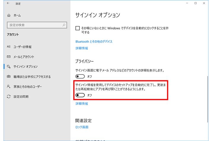 サインインオプションが開いたら下にスクロールする。「プライバシー」にある「サインイン情報を使用してデバイスのセットアップを〜」の項目がこの機能だ。不要ならクリックしてオフにする