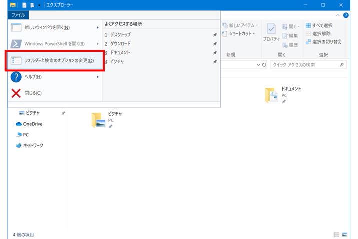 エクスプローラーの「ファイル」をクリックする。メニューが表示されたら「フォルダーと検索のオプションの変更」をクリックする