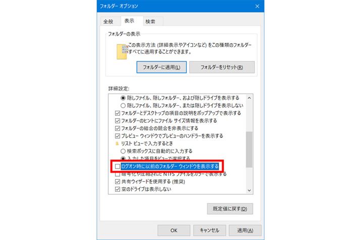 「詳細設定」にある、「ログオン時に以前のフォルダーウィンドウを表示する」がこの機能だ。オンにするならクリックしてチェックを入れ、オフにするならチェックを外す