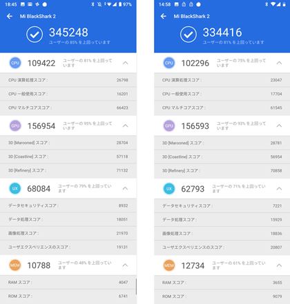 AnTuTuベンチマークのスコア。左が本機(6GBモデル)、右が上位モデル(12GBモデルのもの。サブスコアは6GBモデルのほうが5,000ポイントほど高く、それが総合スコアの差となっている