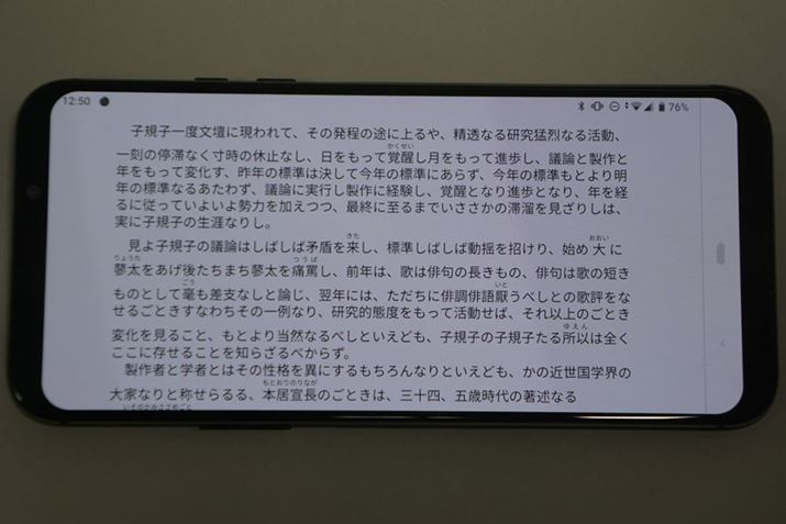 背景を白にして、電子書籍を表示させたところ、色かぶりもなく白がきちんと白く表現できていた。輝度を下げても、色かぶりはほとんど見られなかった