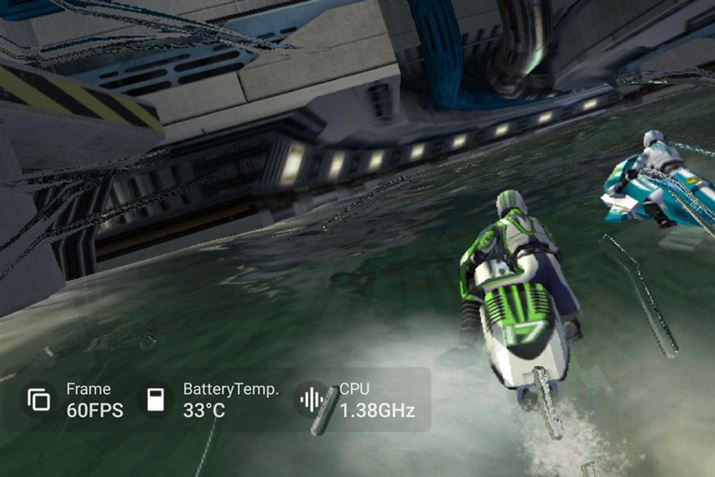 ゲーム中の描画のフレームレートと、バッテリー温度、CPUの動作クロックをリアルタイムで表示でき、処理性能にどれだけ余裕があるのかを把握できる