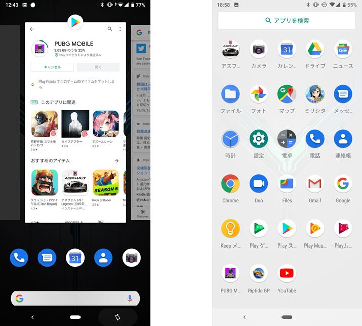 「Black Shark2」のユーザーインターフェイスはAndroid 9の標準に従ったもの。プリインストールされるアプリもAndroid標準がメインのシンプルなものだ