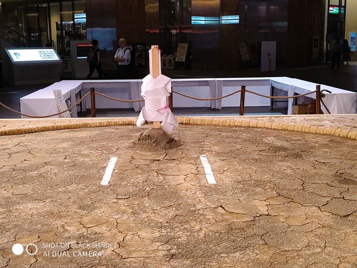 暗めの屋内に設置された土俵を撮影。遠目にはわかりにくい表面のひび割れが生々しい。背景の暗部のノイズも抑えられている
