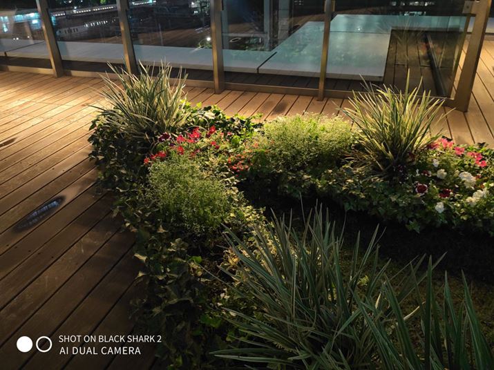 夜の空中庭園で植栽を撮影。暗い場所で接写気味の撮影を行うと、ピントの迷いがやや多くなる。これはそのうちではもっともきれいに撮れた1枚だ。こうした状況では多めに撮影しておくとよさそうだ