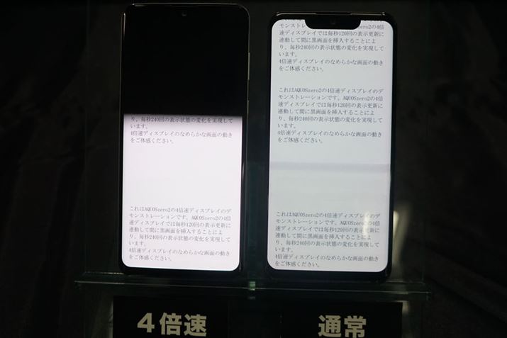 本機の有機ディスプレイは、描画回数を毎秒120回にアップしつつ、残像低減のため各フレーム間に黒画面を挿入し、従来機比4倍相当となる毎秒240回の高速表示を実現している。(2019年9月30日:ディスプレイの性能の記述に間違いがありました。訂正しお詫びいたします。)また、タッチパネルのスキャンレートも4倍速の240Hzに高められており、一般的な液晶ディスプレイと比較して、タッチ操作の応答速度を約80%短縮したという。なお、指紋認証についてもAQUOSシリーズ初となるディスプレイ指紋認証となった。