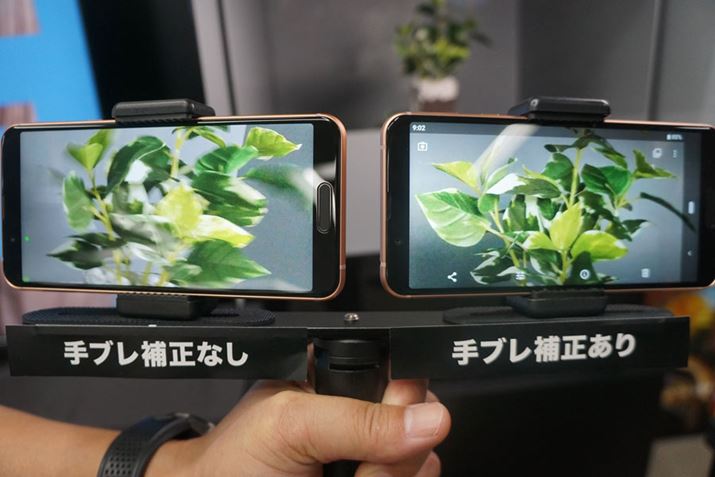 右に本機「AQUOS sense3」を、左に「AQUOS sense2」を並べて手ぶれ補正機能を比較した。本機は電子式手ぶれ補正機能しか搭載されていないが、かなり強力に手ぶれを抑えていた