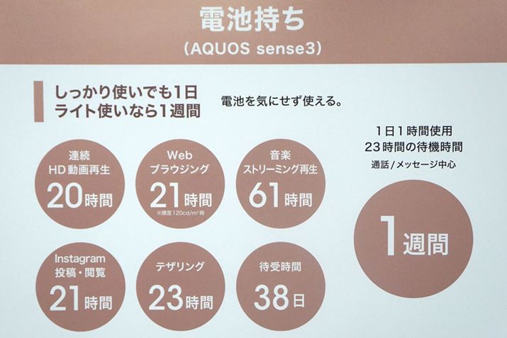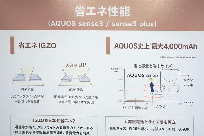 バッテリーは、AQUOS sense3と同じく4,000mAhの大容量。画面が大きい分本機のほうが消費電力が大きいが 、それでも電池持ちにはすぐれているという