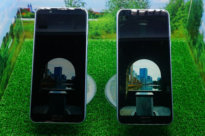 画面を最大輝度にして、右に本機、左に前モデル「AQUOS sense2」を並べた。本機は最大輝度が向上しており、明るい屋外での視認性が向上している