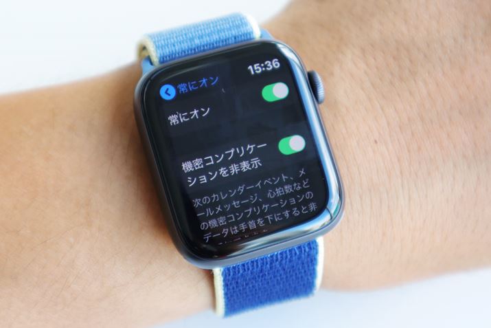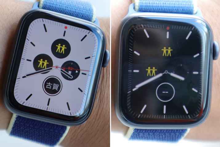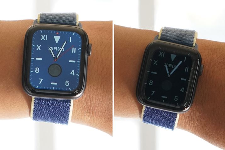 Apple Watch Series 4以前のApple Watchは、消費電力を極力下げるために、利用者が画面を見ていないときは、画面が真っ暗になり、文字盤を見るために手首をクイッと上げたり、デジタルクラウンを押したりすると画面が表示される仕組みだった。デジタル機器にとってバッテリーを一番消費する部品がディスプレイと言われているので、使っていないときに画面を消しておくというのは理にかなっていると思うが、不便なシーンがあったのも事実。